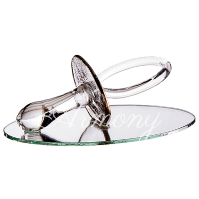 Le miroir ovale, d’une dimension de 8 × 6 cm, reflète subtilement la lumière et met en valeur la tétine en verre transparent. Ce contraste entre le verre et le miroir apporte une élégance discrète, tout en restant parfaitement adapté à une décoration enfantine et poétique.